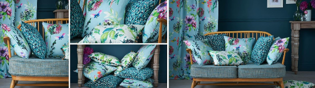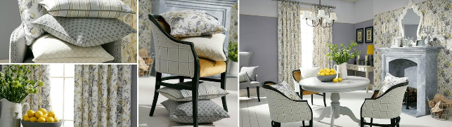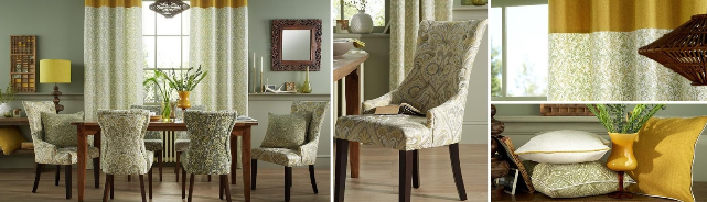 - Текстильне оформлення приміщення не обмежується виключно віконним отвором. Тканина на шторах може поєднуватися з оббивкою м’яких меблів, стільців або ліжка. Залишки тканини після пошиття гардин можна використовувати на наволочки диванних подушок або пошиття покривала для дивана.