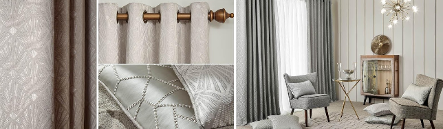 Сірий, як і беж, відносять до базових відтінків фону. Останнім часом його часто використовують у модних скандинавських інтер’єрах та стилістиці хай-тек. Якщо стіни однотонні, то під них можна вибрати фіранки з абстрактним або геометричним малюнком. Шпалери з орнаментом вигідно доповнять прості гладкі портьєри.