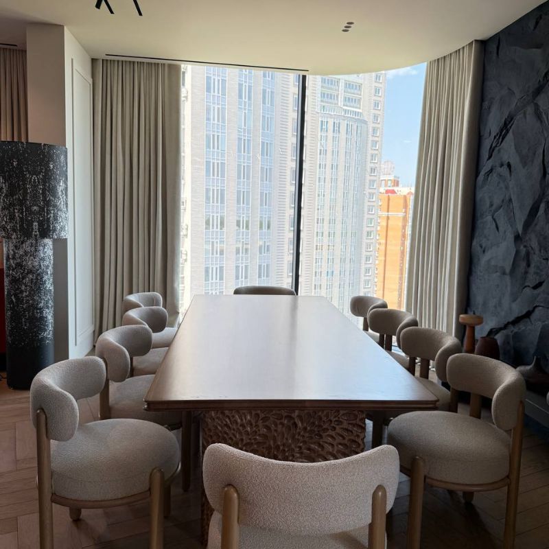 Ми створили бездоганні штори з тканини-букле ніжного бежевого відтінку для їдальні, вони мають підкладку блекаут, яка повністю захищає від сонячного світла і має функцію шумоізоляції.